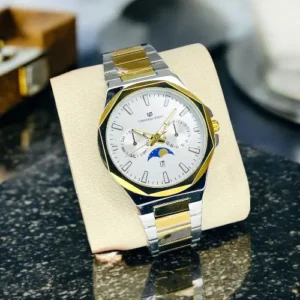 The chronograph feature and moon phase display add a touch of sophistication, making it suitable for both formal events and daily wear. Its high-quality stainless steel body ensures lasting shine and durability, while the scratch-resistant glass keeps it looking new for years.