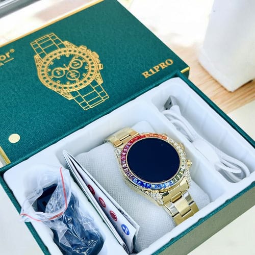 ₨ 7,000Upgrade your lifestyle with this Luxury Smart Watch, a perfect combination of elegance, technology, and durability. Designed with a golden stainless-steel strap and a rainbow crystal bezel, this smartwatch is not just a gadget, but also a fashion statement.