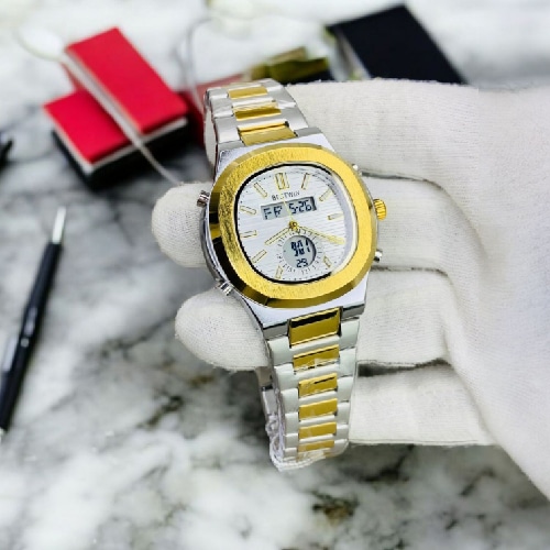 Upgrade your style with the Bestwin Men’s Luxury Gold Silver Analog Digital Watch. Designed with a striking two-tone stainless steel bracelet and a golden bezel, this men’s wristwatch offers both elegance and durability. The unique combination of analog hands and digital display ensures accurate timekeeping and modern functionality.